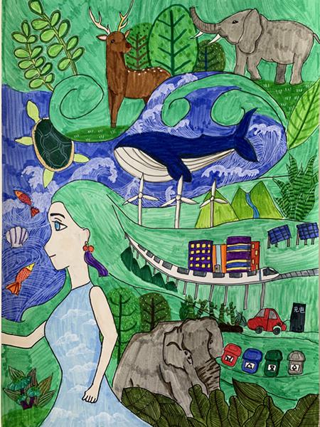寓意:春姑娘披著一頭翠綠的長(zhǎng)發(fā)緩緩地朝我們走來了。輕柔的暖風(fēng)送來鳥兒的歡歌。各種新嫩枝葉都敞開了胸懷,有翠綠的,嫩綠的,深綠的,一起享受著這從密葉林間穿透而過的初夏的陽(yáng)光。在這綠茵茵的發(fā)絲上風(fēng)車隨意的轉(zhuǎn)動(dòng)著一圈又一圈,青山綠草在春姑娘翠綠的發(fā)絲中探了出來,城市的新地、高樓、高鐵、充電節(jié)能小汽車、還有風(fēng)力發(fā)電……一片欣欣向榮的景象沐浴著生活的陽(yáng)光,在飄逸長(zhǎng)發(fā)中搖曳。春姑娘那溫柔美好的眼神,甜甜的微笑,還有細(xì)微的眉頭,都能讓人感受到生命的美好,各種小動(dòng)物、植物也都隨著他們的腳步在春光中醒來,展示著生命的可貴。